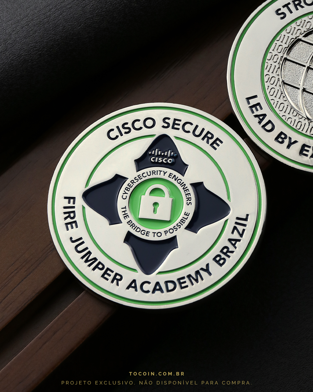 Para capturar a essência da CISCO e seu compromisso com a segurança, nosso time trabalhou em um design que alia sofisticação e significado. Com detalhes precisos e um acabamento impecável, a moeda reflete a identidade da empresa, destacando-se como um item exclusivo que vai muito além de um brinde corporativo: é um símbolo de pertencimento e reconhecimento.